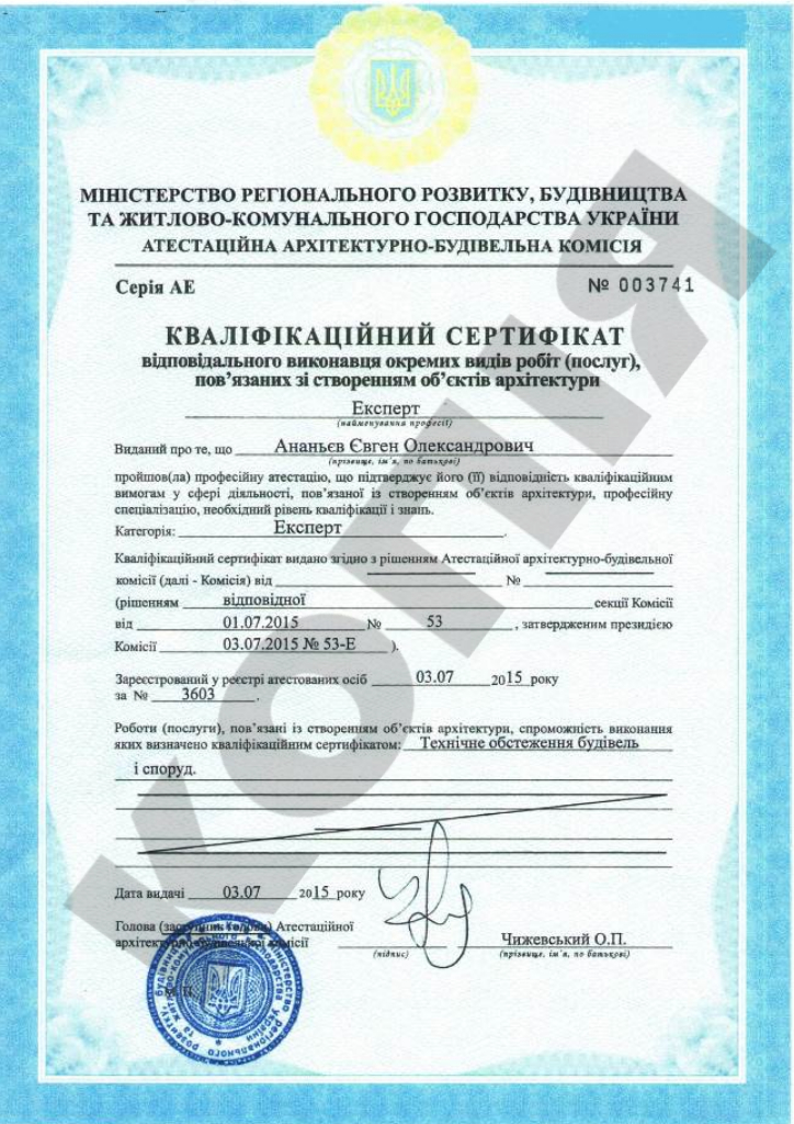 Головний експерт – Ананьєв Євген розбирається в багатьох тонкощах будівельних конструкцій сучасних будівель і архітектурних «пам’ятників». Сертифікат експерта АЕ 003741 виданий 03.07.2015 Атестаційної архітектурно – будівельною комісією Міністерства регіонального розвитку, будівництва та житлово-комунального господарства України. Свідоцтво про підвищення кваліфікації фахівця N 2438751 04.02.2020 – підтверджують професійні та ділові якості для здійснення ТО будівель і складання звіту про доступність МГН.